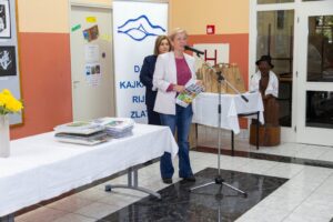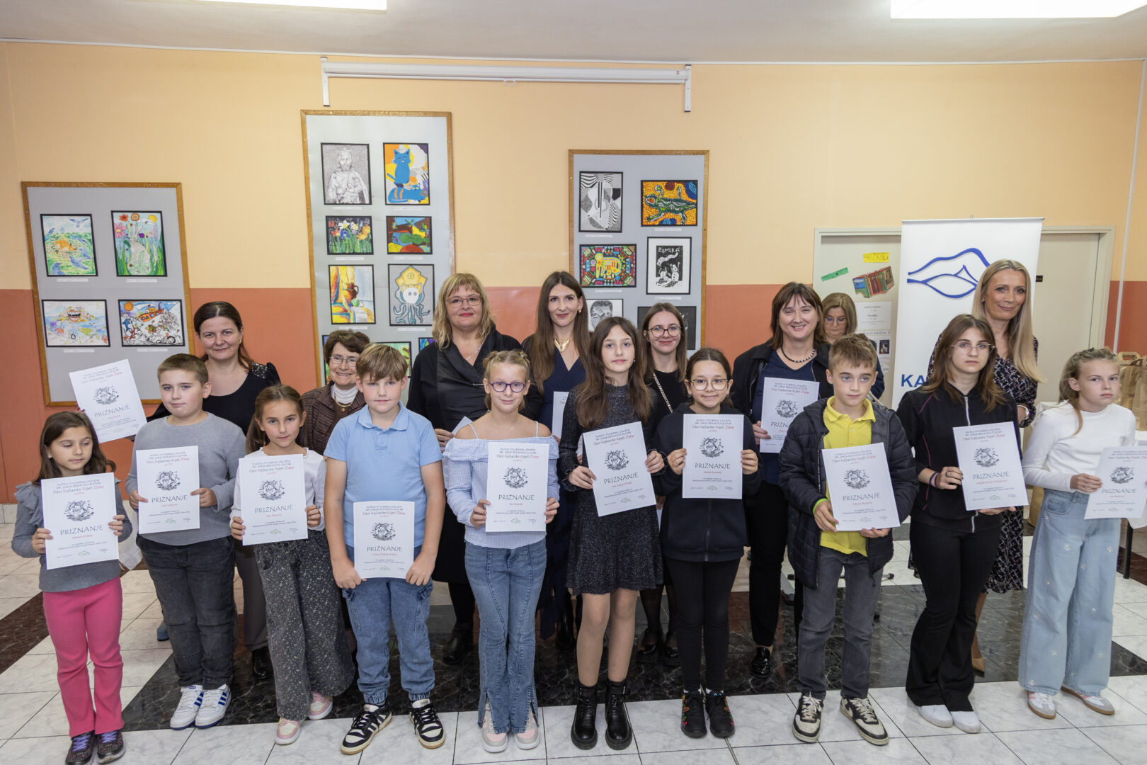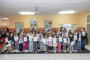 Tradicionalna dječja likovna izložba „Čovjek čovjeku“, najstarija priredba u sklopu Dana kajkavske riječi, okupila je u subotu, 27. rujna, mlade likovne stvaraoce iz brojnih škola kajkavskoga govornog područja te njihove učitelje. Okupljene učenike i njihove mentore u predvorju naše škole pozdravila je u ime organizatora, Pučkog otvorenog učilišta dr. Jurja Žerjavića, ravnateljica Gordana Valjak, u ime škole domaćina i njezina ravnatelja učiteljica Ljiljana Mutak te u ime Grada Zlatara zlatarska gradonačelnica i saborska zastupnica Jasenka Auguštan Pentek. Na ovogodišnji je natječaj pristiglo gotovo 900 radova iz 54 škole, a izloženo je 89 radova iz 32 škole. Među njima našli su se i radovi naših učenika: Luke Vukovića, Mihaele Erdelje, Viktora Maksa Hudića, Nele Bartolin, Irine Vidović Popek, Kijare Mikulec, Helene Kovaček, Viktora Mudronje, Lee Fuček, Sabine Kuntić, Danijele Korpar Gašparović, Izabele Hitrec, Jane Benković i Dore Šimunić. Njihove su mentorice učiteljice Blanka Sviben, Marina Sviben, Silvija Adanić, Ljiljana Mutak, Maja Burek, Valentina Lebić-Naumovski i Kristina Sviben. Izložbu je pripremila i postavila učiteljica likovne kulture Maja Burek. (M. Posarić)