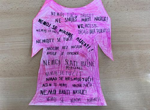 Učenici 1.a su na satu razrednika razgovarali o početku običaja ružičastih majica. Zatim što je sve nasilje i kakvo može biti. Improvizirali su dramatizacijom različite vrste nasilja i što žrtva treba napraviti. Samostalno su pisali poruke protiv nasilja koje su u grupnom radu prepisivali na hamer majicu koju su i sami ukrasili.