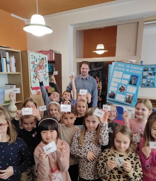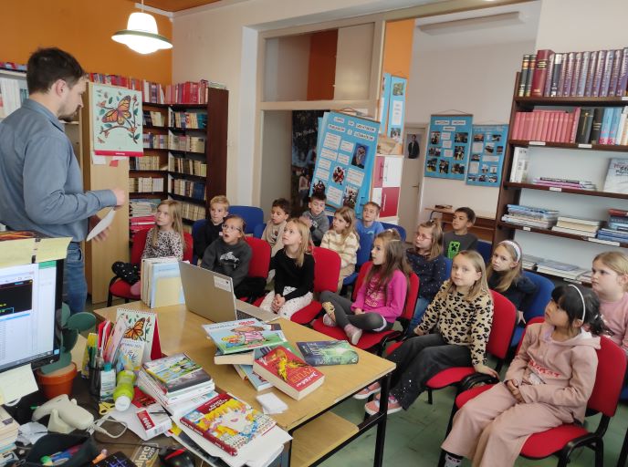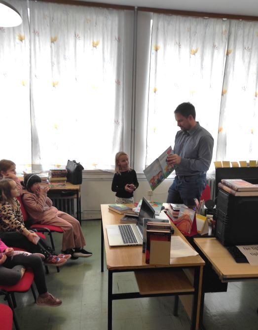 U četvrtak, 21. studenoga, učenici 1. b razreda sa svojom su učiteljicom prvi put posjetili školsku knjižnicu.  Knjižničar ih je dočekao toplom dobrodošlicom i pokazao im koliko se zanimljivih i šarenih knjiga skriva na policama. Naučili su razliku između knjižnice i knjižare, kako se treba ponašati u knjižnici , kako se knjige posuđuju i kamo ih mogu vratiti kad ih pročitaju. Također su saznali da u knjižnici mogu provoditi slobodno vrijeme tijekom odmora sudjelujući u raznim aktivnostima i igrama. Knjižničar im je podijelio članske iskaznice i time su službeno postali novi članovi knjižnice. Učenici su s velikim zanimanjem razgledavali police i odabrali svoju prvu knjigu za posudbu. Za mnoge od njih to je bio prvi susret s knjižnicom, a na njihovim se licima jasno vidjelo uzbuđenje i veselje. Cilj posjeta bio je potaknuti ljubav prema čitanju i razviti naviku redovitog dolaska u knjižnicu. (Marina Sviben)